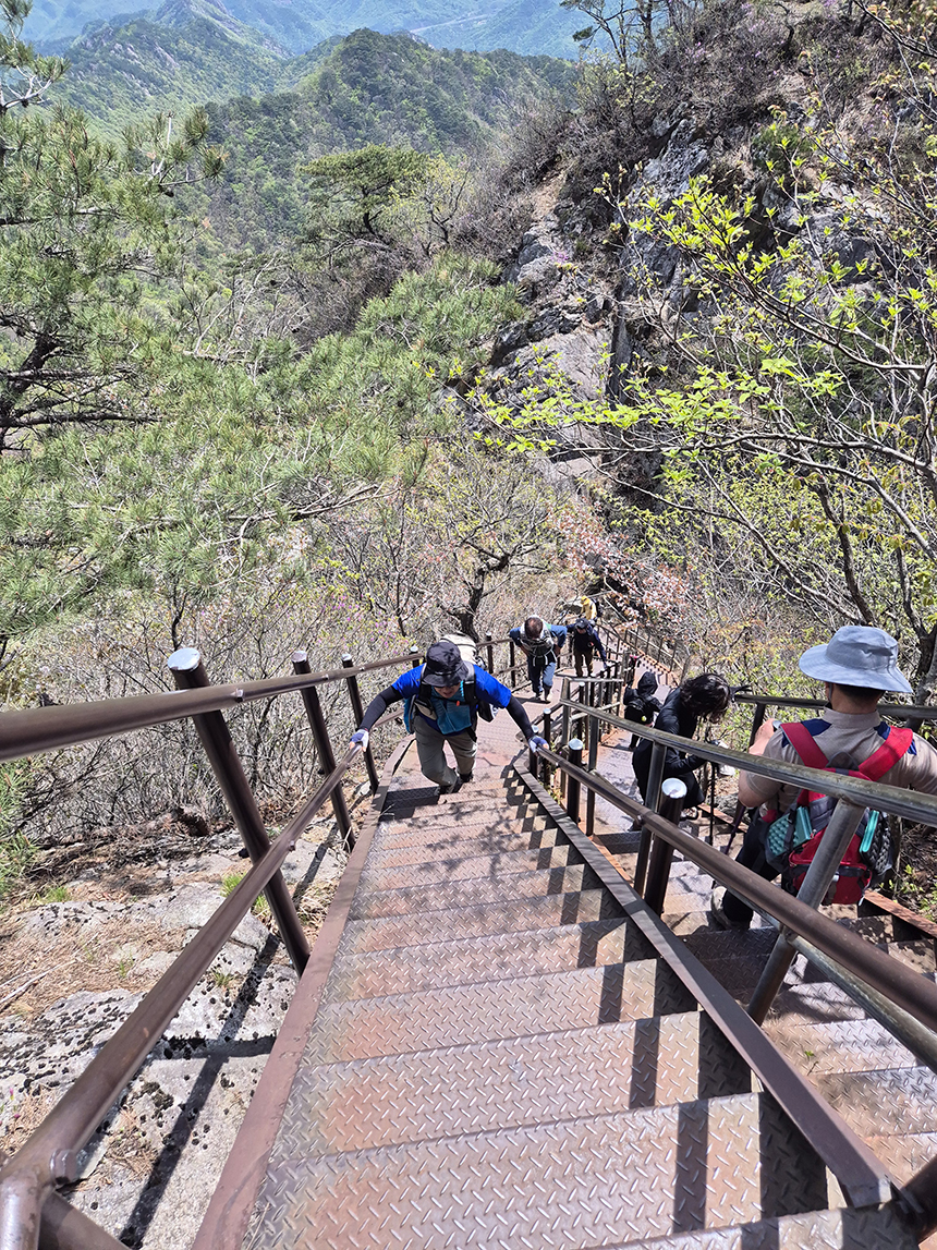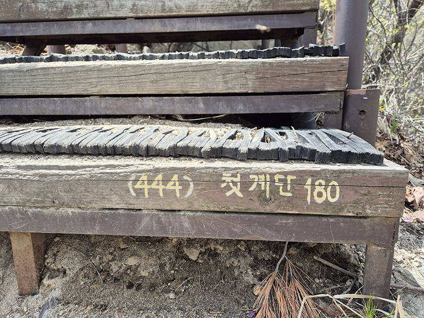 자연성릉을 빠져나오면 관음봉에 오르는 마지막 구간인 '천국의 계단'을 만납니다. 왜 천국의 계단이냐고요? 뭐 그냥 붙인 거예요. 444개의 계단수가 표시되어 있어요. 오르다 보면 금방 오르긴 하는데 여기까지 오며 힘 빠진 다리로 오르니 힘겹긴 하죠~~