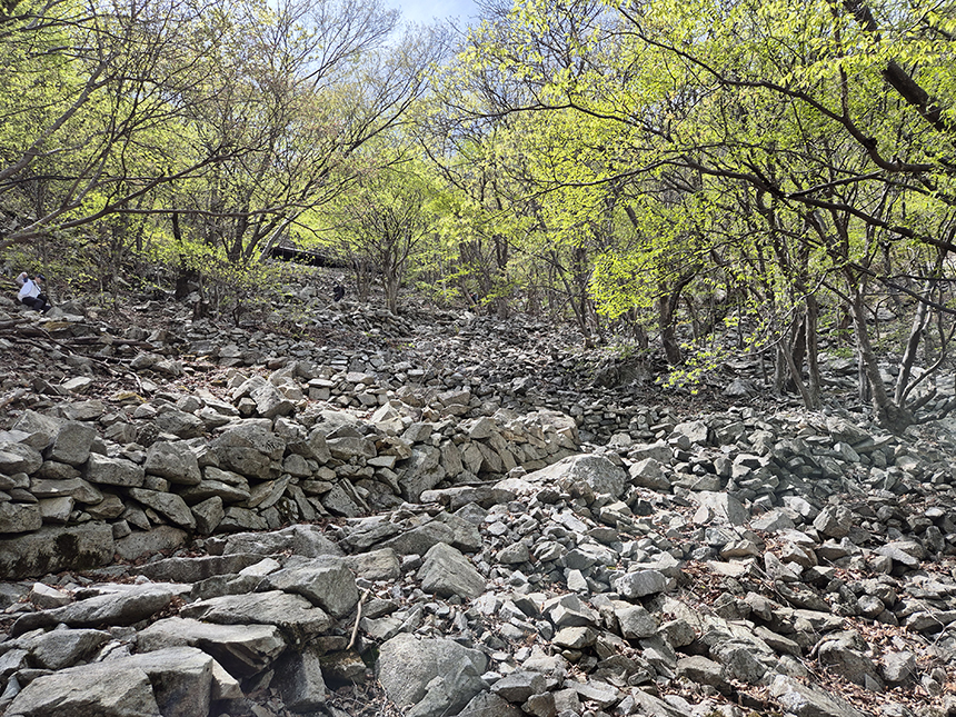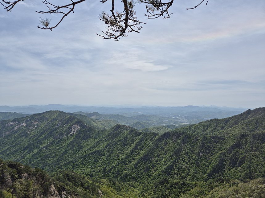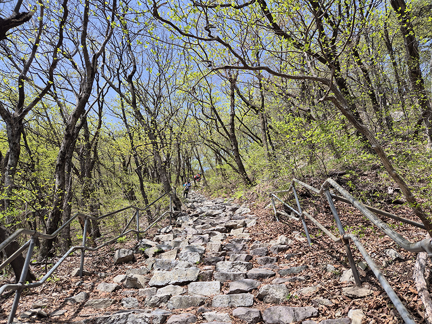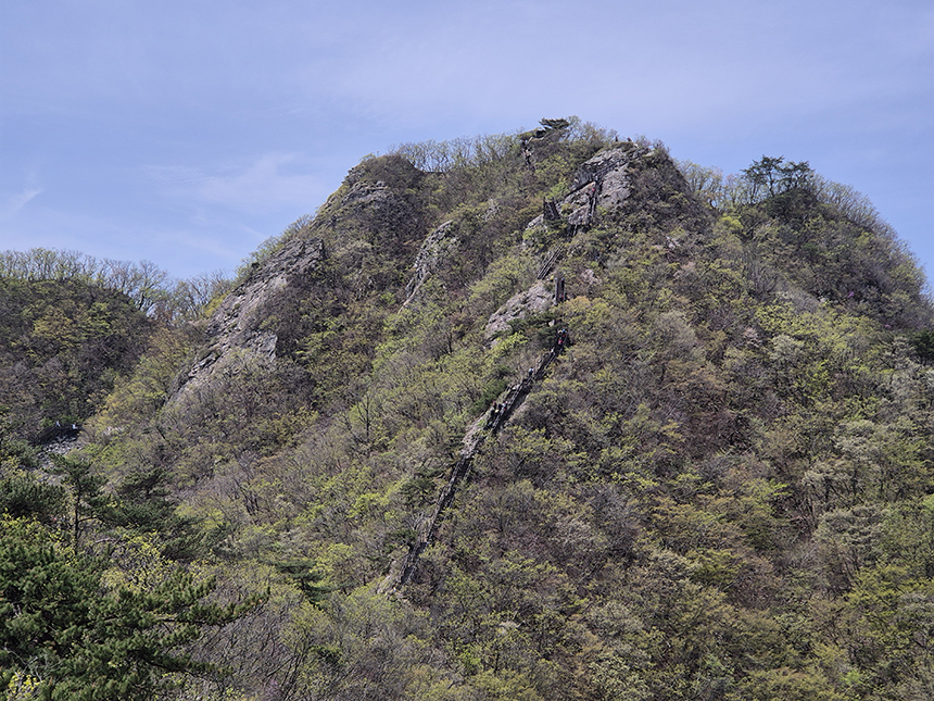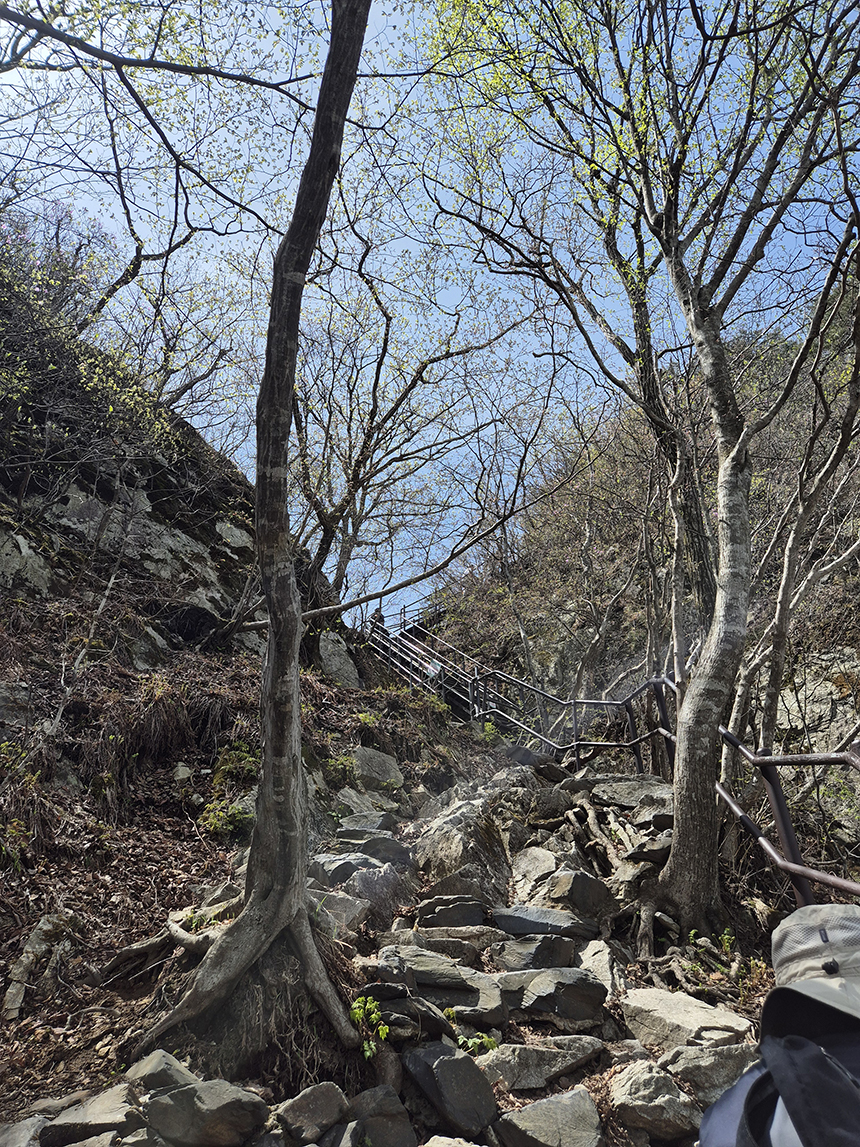 정상부 부근은 아직 나무에 잎이 덜 피어 앙상한 나무들이 보인 반면 아래쪽으로 내려갈수록 녹음이 짙어지며 하늘을 서서히 가리게 되네요.