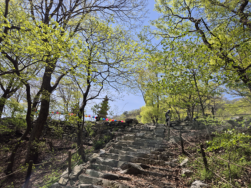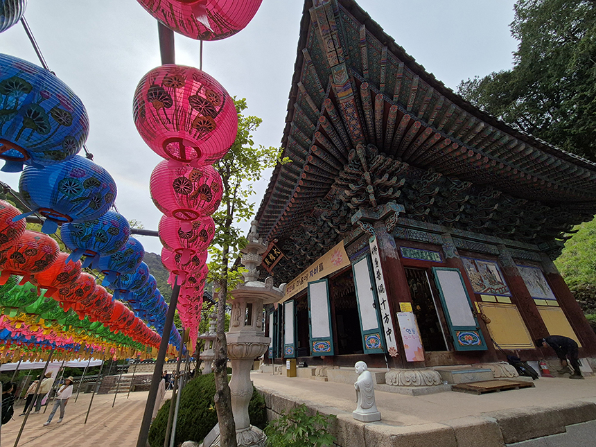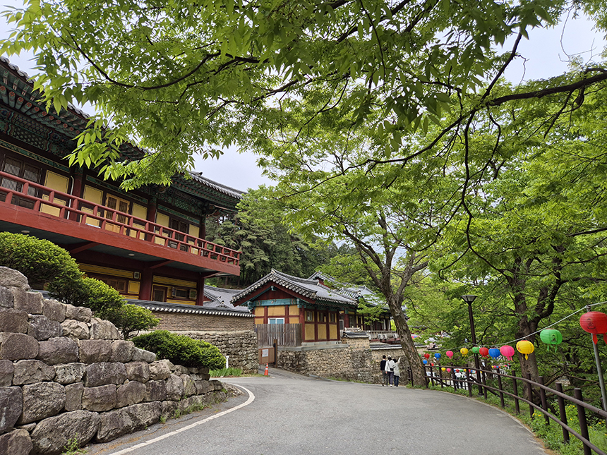 산속 자연을 감상하며 오랜만에 땀 흘리며 걷다 보니 어느덧 동학사에 도착을 했네요. 이곳 동학사에도 부처님 오신 날을 맞아 형형색색의 연등이 줄지어 걸려있고 계곡 위로는 푸른 나뭇잎이 가득해 시원한 그늘을 만들고 있습니다.