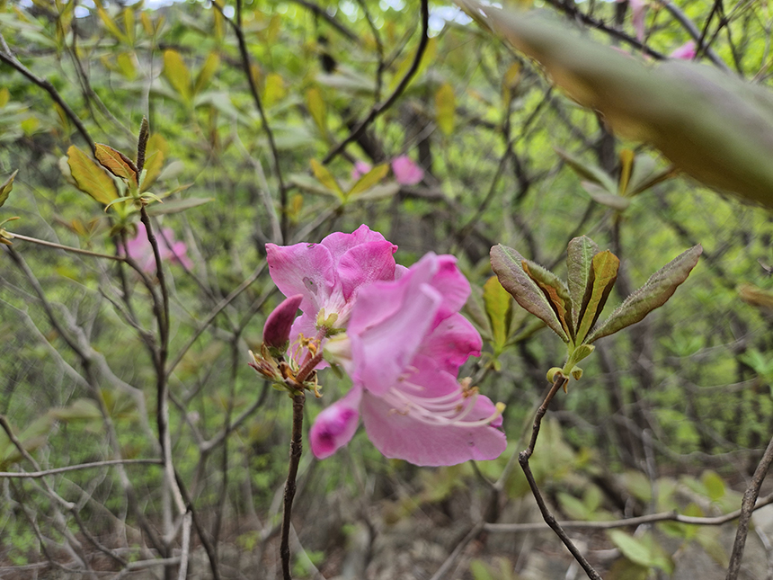 등산로 주변에 아주 연한 연핑크와 핑크의 진달래 꽃이 피어 있는데 평소 보던 진달래와는 조금은 다르게 우아한 한복과도 같은 색감이 특이해서 담아봤어요.