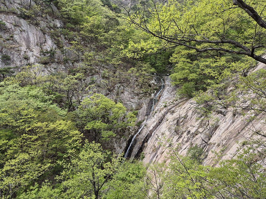 폭포를 지나 멀리 보이는 산중엔 연두색 물결이 일고 잎이 피기 시작할 때 보이는 연두색이 너무 좋습니다. 여름의 진녹색도 좋지만 연두색의 신선함과 풋풋함이 더 눈에 들어옵니다.