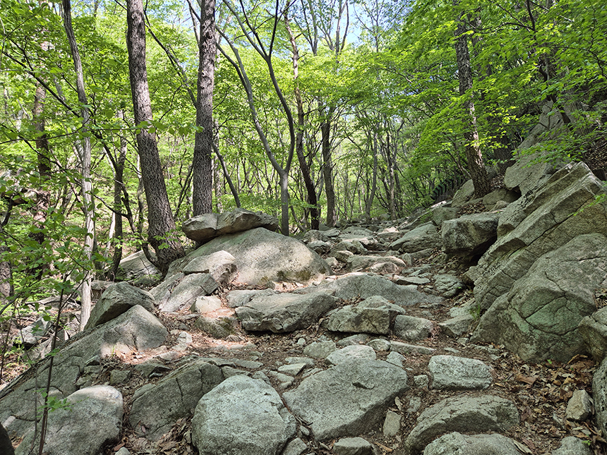 여기서부터는 은선폭포를 거쳐 동학사까지 거의 하산하는 코스로 초반에는 데크 계단을 따라 내려오다 바위를 쌓아 만든 경사진 돌계단길을 내려옵니다. 오르막보다 내리막이 더욱 위험할 수 있으니 무리하지 말고 주의해서 하산하셔야 합니다.