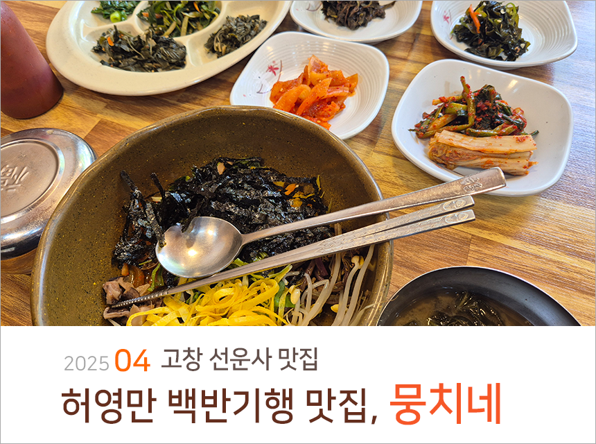 처음 3~4년전에 선운사를 방문했을 때 간단하게 식사하려고 들른 "뭉치네집", 여러 메뉴 중 산채비빔밥을 주문했는데 맛있게 먹었던 기억이 있어 올해도 한번 더 다녀왔어요. 오늘은 고창 선운사의 산채비빔밥 맛집, 뭉치네집을 소개해 볼게요.