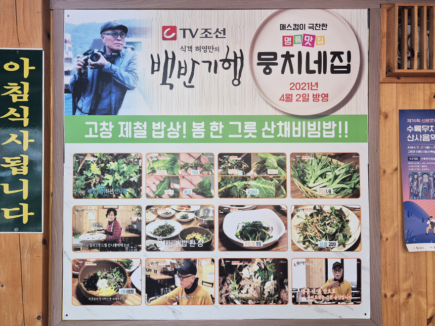 맞네요~ 처음 방문했을 때 바로 얼마 전 허영만 화백의 백반기행을 촬영했다고 들었는데.. 그럼 지금으로부터 4년 전이네요. 사실 산채비빔밥만 기억이 나고 가게 이름이 기억이 나질 않았는데 입구의 허영만의 "백반기행" 촬영장면과 주메뉴 현수막이 걸려 있어 쉽게 찾을 수 있었어요.