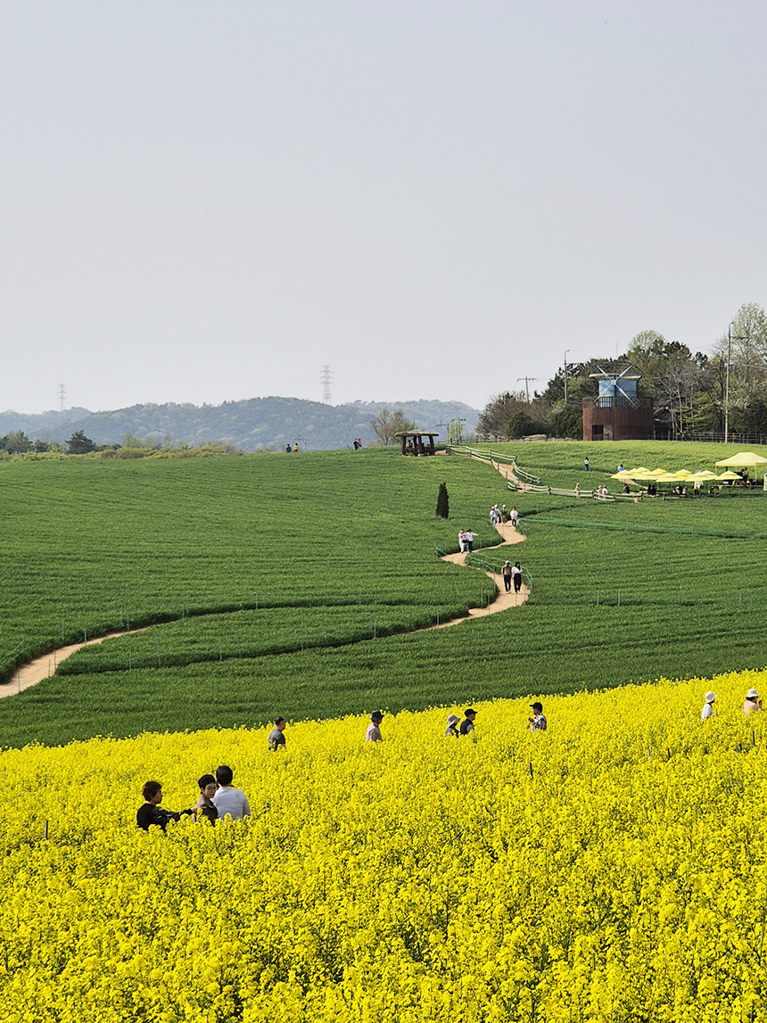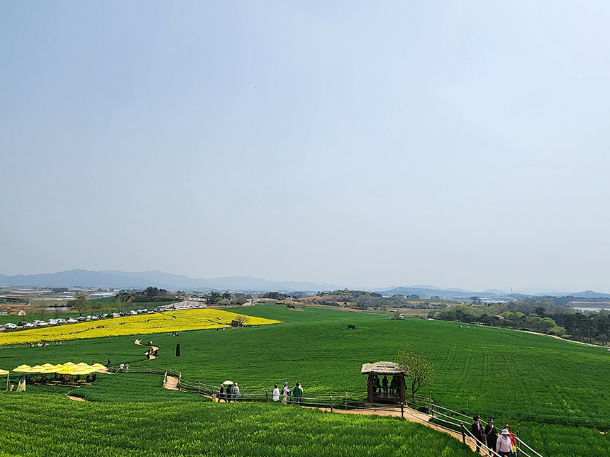 보리밭과 유채꽃밭 사이로 난 황톳길을 따라 산책하듯 걸어봅니다. 엄청나게 넓은 밭을 푸른 청보리가 마치 잔디처럼 푸른색으로 덮고 있는 진풍경이 펼쳐지고 함께 자리한 유채꽃밭에선 진한 유채꽃 향기는 느낄 수 있어요.