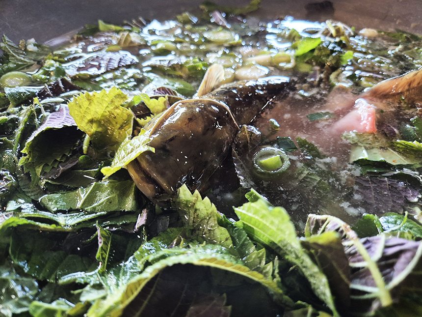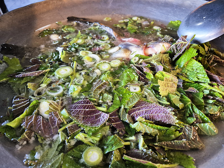 2인분에 중자 크기의 메기가 2마리 들어가는데 크기에 따라 마리수가 좀 달라지는 것 같아요. 깻잎을 비롯한 야채가 듬뿍 들어가고 끓기 시작하면 직접 손으로 수제비를 떼어서 넣어주더라고요.
