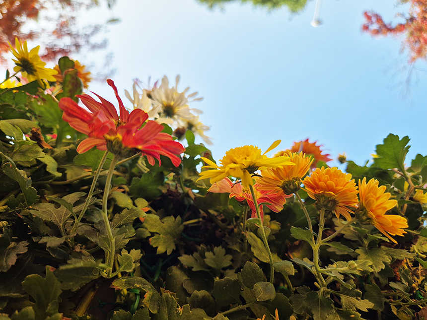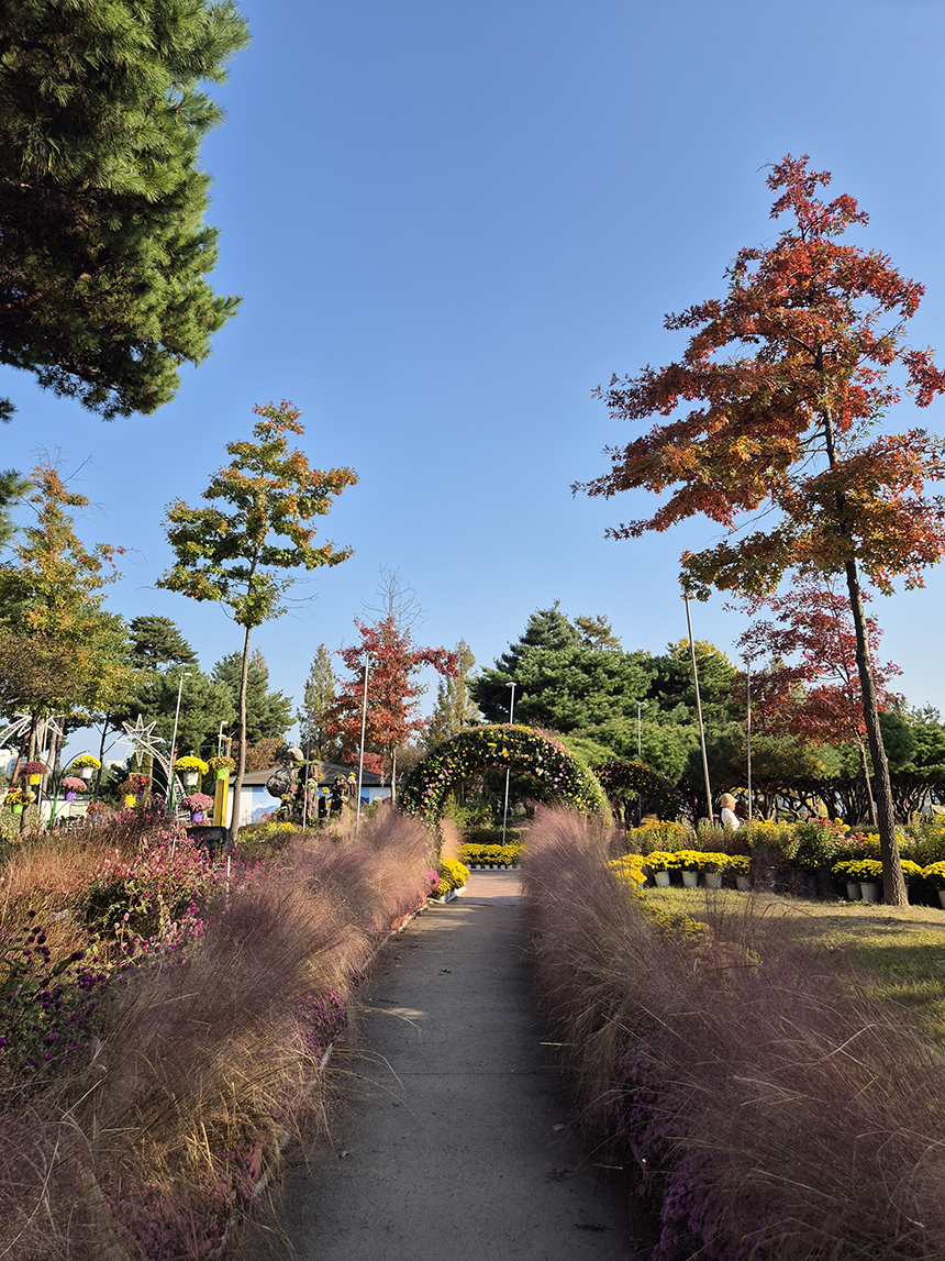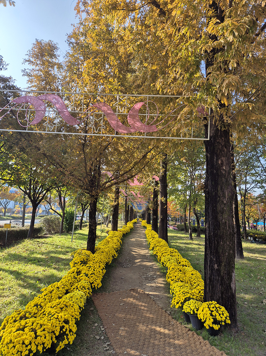 넓은 공원에도 어느덧 가을이 자리를 잡았네요. 노란색, 흰색, 분홍색, 자주색 등 형형색색의 국화들이 줄 지어선 꽃길을 따라 천천히 걸으며 숨을 들이쉬면 달짝지근한 국화향이 은은히 풍겨옵니다. 한참 핀 국화꽃길을 따라 걸어보세요. 아직도 국화는 한창이에요.