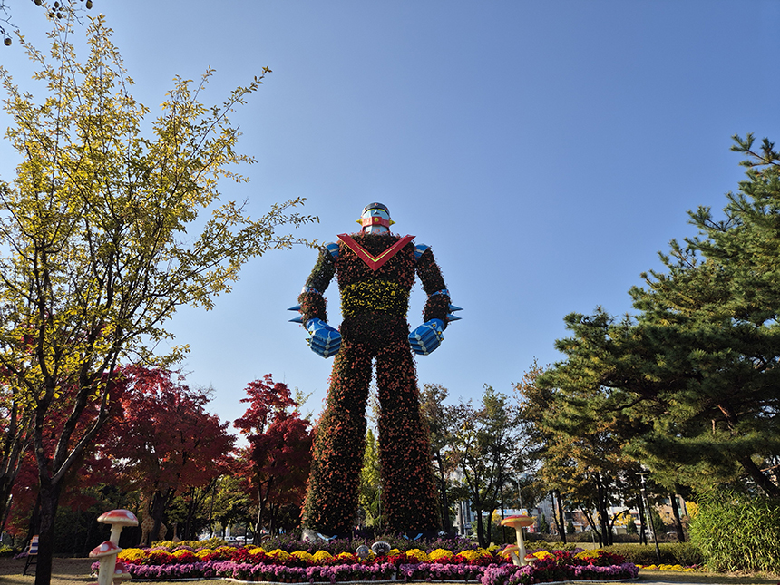 국화를 이용한 거대한 풍차는 이국적인 풍경으로 가을 하늘과 조화를 이루고 그 옆에는 로보트 태권V 모양의 국화 작품이 위풍당당하게 서 있습니다. 아이들은 눈을 반짝이며 태권V 앞에서 사진을 찍고, 어른들은 그 앞에서 예전 추억을 떠올리곤 합니다. 어렸을 적에 많이 보긴 했죠. ㅎㅎ