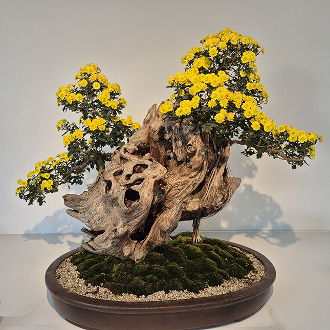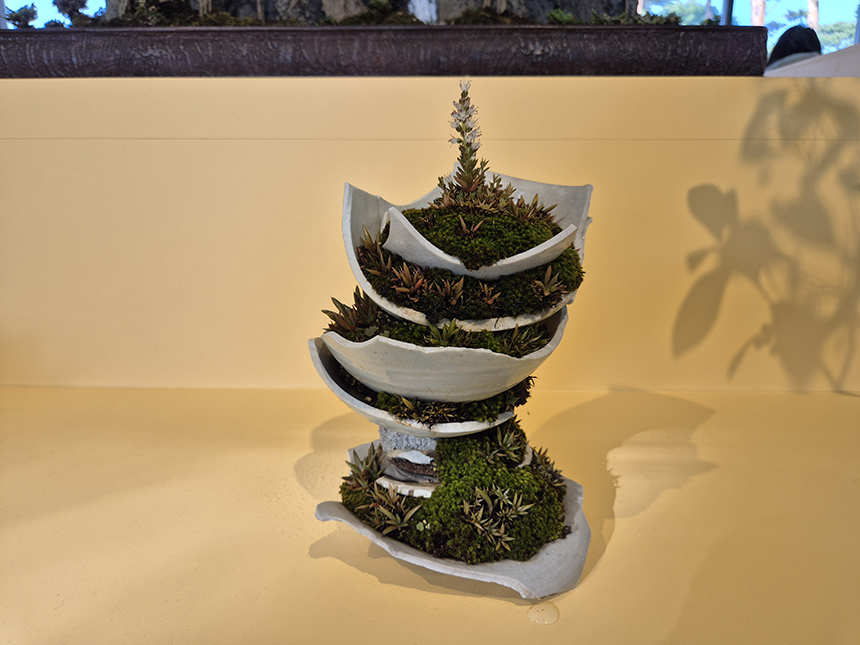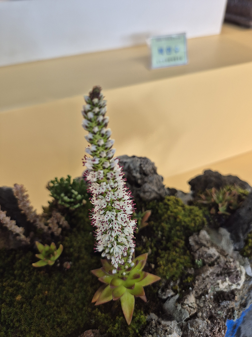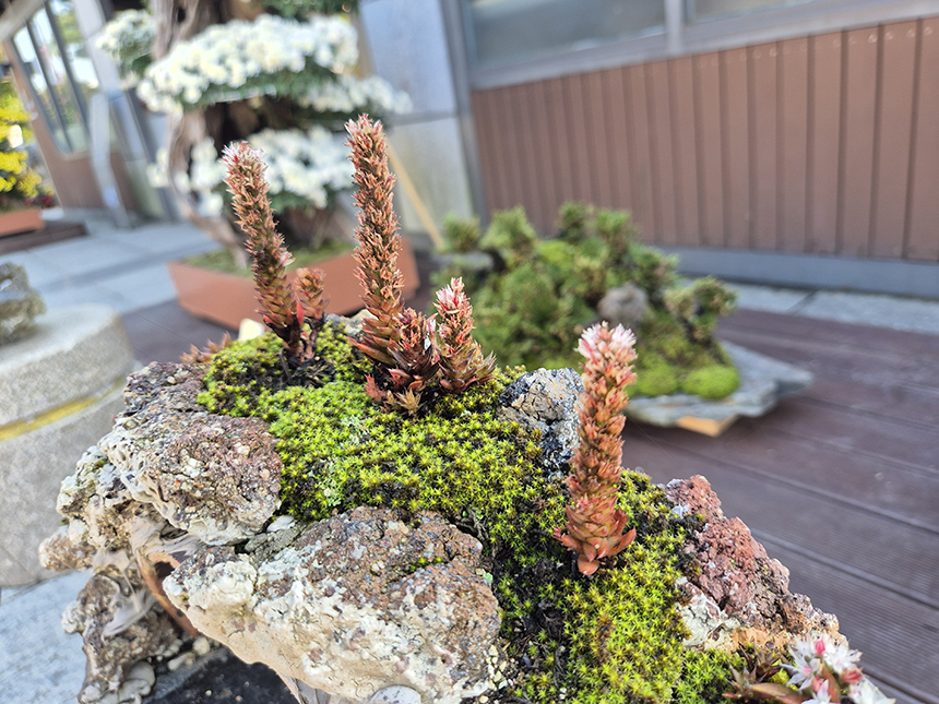 어떻게 저렇게 키웠을까 싶을 정도로 신기하게 국화꽃이 피어 있고 작은 돌을 쌓아 올리고 와송과 다육이가 자라며 꽃이 피어있더라고요. 참 키우기 어려울 텐데.. 아주 멋진 국화 분재작품들을 통해 분재 안에 담긴 시간의 깊이를 새삼 느끼게 됩니다.