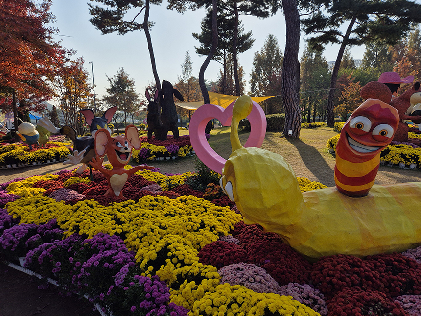 국화꽃사이에서 뛰어다니는 모양의 톰과 제리, 국화꽃사이를 기어 다니는 지렁이 모양의 라바 캐릭터 등 꽃만 있는 것이 아니라 다양한 창작물들이 함께 공존하는 큰 전시장처럼 누구나 즐기고 감상할 수 있어 참 좋은 것 같아요.