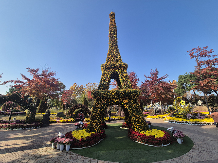 공원에서 가장 인상 깊었던 건 꽃들 사이의 국화를 엮어 만든 조형물들이에요. 에펠탑 모양, 궁전 모양 등 큰 국화조형물부터 코끼리, 사슴 등의 다양하고 귀여운 동물 조형물, 섬세하게 다듬어진 분재 국화까지 마치 동화 속 정원에 들어온 듯한 기분이 느낄 수 있을 거예요.