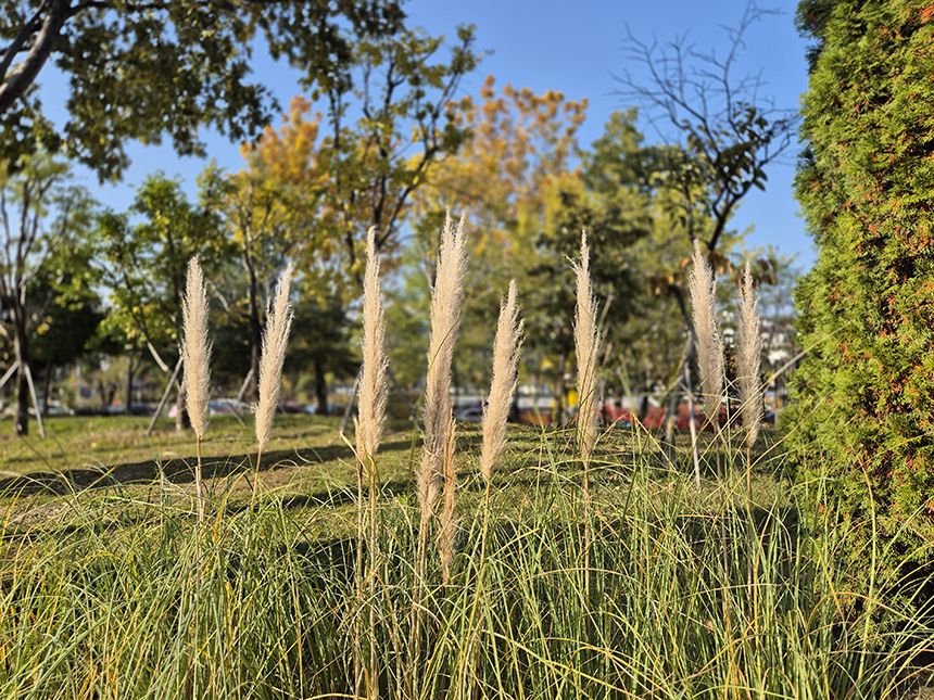 공원 중앙의 연못인 반도지는 여전히 고요합니다. 잔잔한 수면 위 바람에 흔들리는 물결마다 가을 햇살이 반짝거리고 한 폭의 수채화를 그려내듯 반도지의 수면에 비친 정자와 국화, 연잎들의 조화가 참 잘 어울리네요. 바람에 나부끼는 핑크뮬리를 따라 반도지를 한 바퀴 돌아보세요.