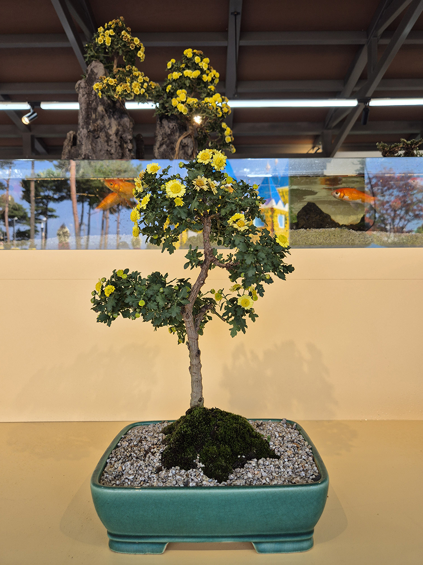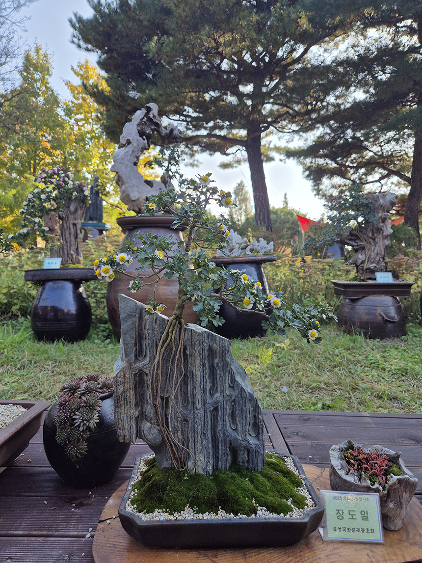 국화꽃뿐만 아니라 또 다른 볼거리, 축제 기간에는 분재 전시회도 함께 열리고 있어요. 섬세하게 다듬어진 국화와 와송, 다육이 등 다양한 분재 작품들이 전시되어 있으며, 작은 나무 하나하나에 오랜 세월의 정성과 예술적 감각을 느낄 수 있어요.