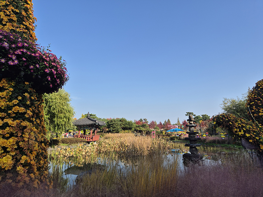 따뜻한 바람과 함께 퍼지는 국화 향은 마음 깊은 곳까지 잔잔히 스며들고 국화와 연못이 하나로 어우러진 풍경은 한 폭의 수채화 같은 장면을 연출됩니다. 반도지를 따라 걷는 그 길 위에서, 국화 향기를 느끼며 걷는 꽃길에서 잔잔한 행복을 만나고 잠시 일상을 내려놓고 가을의 여유를 만끽할 수 있아요.
