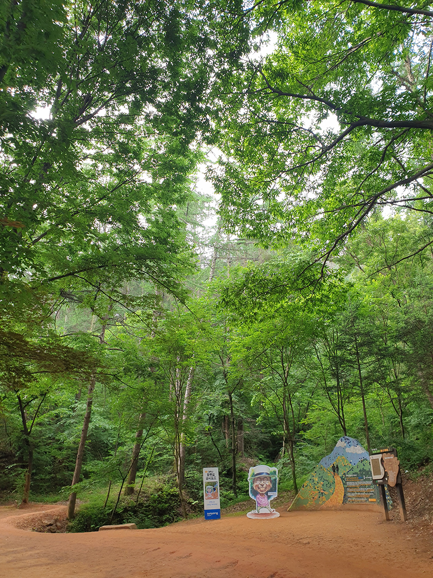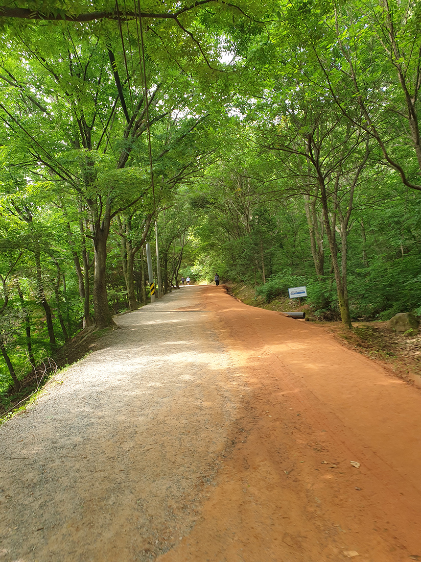 황톳길을 따라 자란 자연림 숲이 참 울창하죠? 장동산림욕장부터 펀펀한 공연장 부근까지는 황톳길을 걷는 분들이 많은 데 가면 갈수록 순수하게 트레킹 하듯 걷는 분들 위주가 됩니다. 황톳길도 좀 좁아지면서 우리는 신발을 신었지만 굳굳이 맨발로 저 황톳길을 걷는 분들도 계시네요.