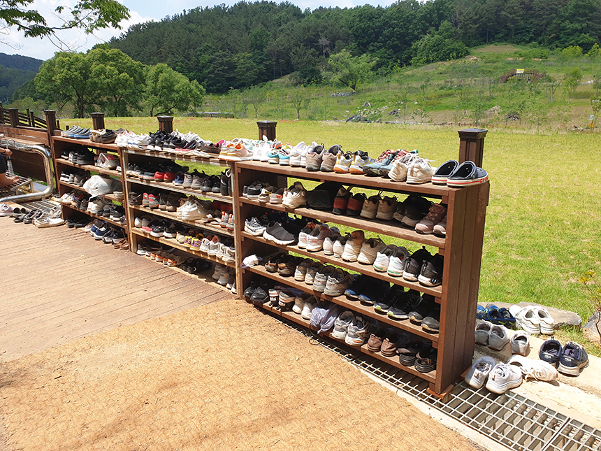 장동산림욕장을 시작으로 황톳길이 시작되다 보니 입구에서부터 신발을 벗어 놓고 가시는 분들, 신발장에 가지런히 놓인 신발들.. 앉아서 황토로 물든 발을 씻을 수 있는 수돗가도 마련되어 있어요.