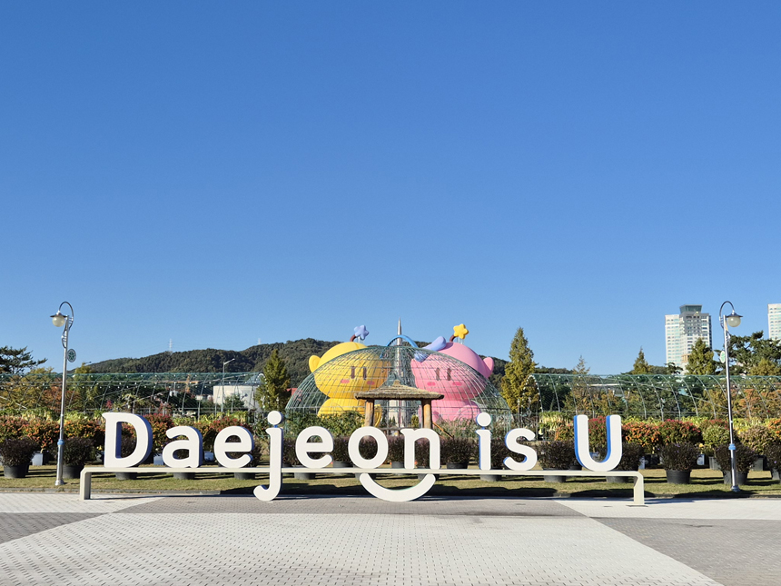 뒤로는 엑스포 시민공원과 엑스포 마스코트인 꿈돌이, 꿈순이, 그리고 한빛탑이 자리하고 있어요.
