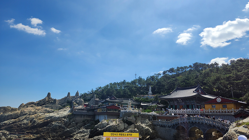소원지가 걸려있는 길을 따라 내려가 방생터에선 사찰을 한눈에 올려다 볼 수 있고 대웅보전 위쪽으로 올라가면 사찰과 동해바다를 한눈에 펼쳐지는 멋진 장관을 감상할 수 있습니다.