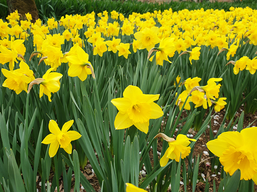 홍문을 둘러싼 담장 아래로 흰색과 노란색의 수선화 꽃밭이 펼쳐집니다. 수선화의 샛노랑과 우유빛 흰 꽃잎이 참 예쁘네요.