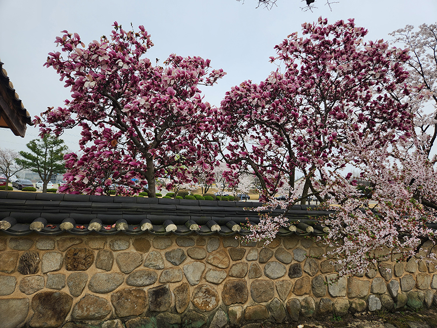 돌과 흙으로 쌓은 자연스러운 느낌의 담장을 따라 봄을 맞이하듯 부지런히 피어 올린 백목련과 자목련이 하나 둘 꽃잎을 떨구고 있고 겨우내 낙옆 떨구고 맨몸으로 버틴 나무들에서는 새록새록 새싹이 피기 시작합니다.