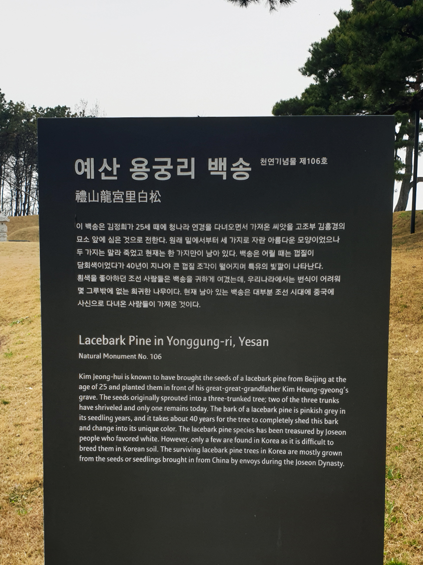 고택에서 300미터 가량을 가시면 천연기념물인 용궁리 백송을 만날 수 있어요. 백송이라 함은 말 그대로 둥치가 흰빛을 띠고 있어 직접 보면 흔히 보는 소나무 껍질과는 전혀 다른 수피의 소나무입니다. 이 용궁리 백송은 추사 김정희 선생이 청나라에 다녀오면서 씨앗을 가지고 와 심은 것으로 전해집니다.