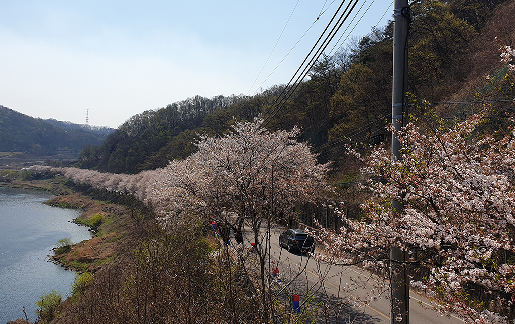 높이 자란 벚꽃이 도로를 덮은 터널처럼 뒤덮고 있고 부용 1리와 2리 사이의 중간에 있는 정자에 오르면 도로를 따라 핀 하얀 벚꽃을 한눈에 즐길 수 있어요.