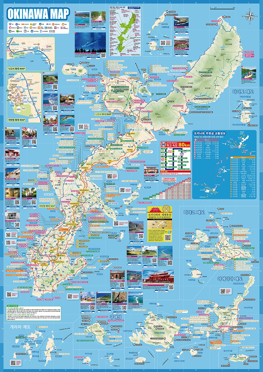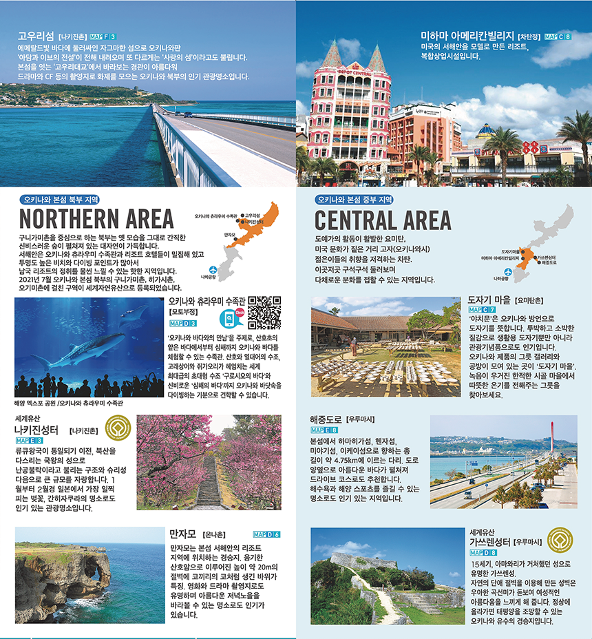 오키나와 본섬과 나하시, 주변 섬에 대한 여행 정보를 제공하는 가이드맵으로 지역별 주요 명소와 볼거리, 즐길거리가 정리되어 있습니다.
