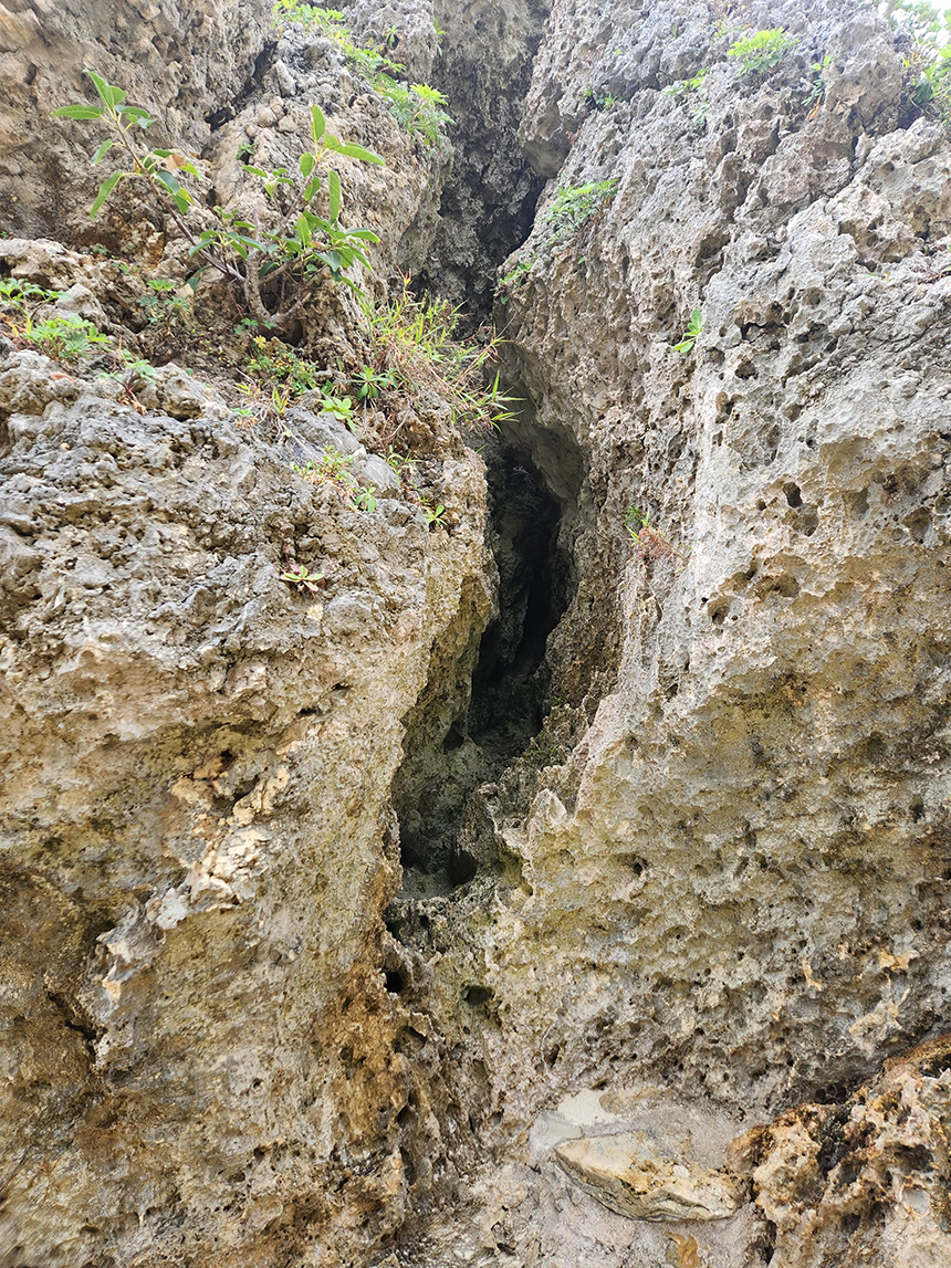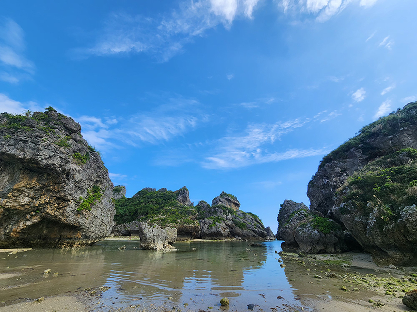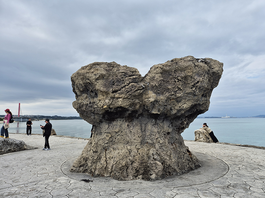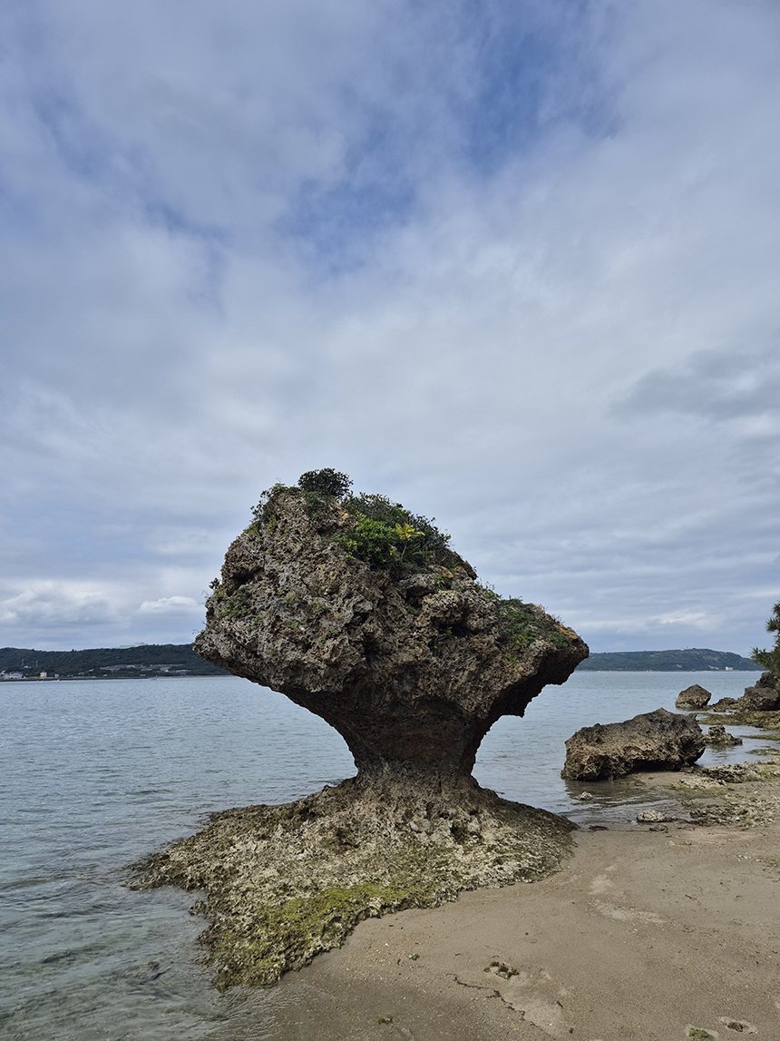 카후반타에 가기 전에 우측으로 연결된 섬이 있어 저기엔 무엇이 있을지 드라이브 겸 다니던 중 해변가의 침식 바위가 엉클어진 경관이 눈에 띄어 잠시 멈췄습니다. 이곳은 아마미추의 무덤, 류큐개벽 신화에 나오는 신의 무덤이란 작은 갯바위 같은 곳인데 흔히 우리가 생각하는 무덤 흔적은 볼 수 없고 멀리서 보면 멋진 기암으로 이루어진 바위섬 같은 느낌입니다.