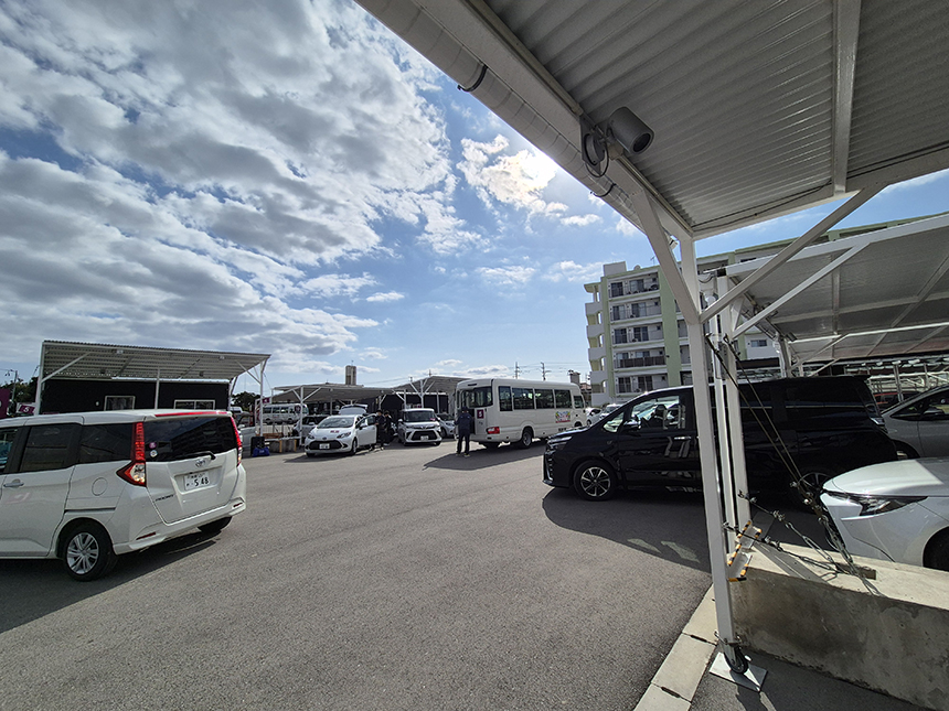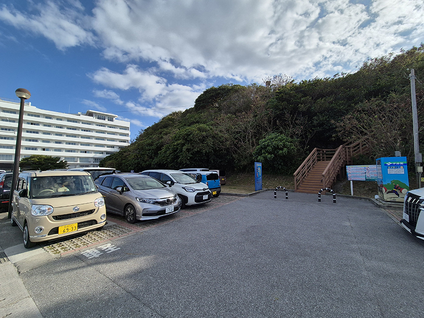 첫 번째 목적지인 바닷가의 석양이 아름다운 20분 거리의 우미카지테라스에 도착하니 도로변에 줄지어 주차를 해놓긴 했지만 혹시나 하는 마음에 주차장을 찾아보았어요. 테라스 앞을 지나 무료 주차장을 찾으니 자리가 없을 정도로 차량이 가득한데 다행히 출차 차량이 있어 무사히 주차를 했습니다.