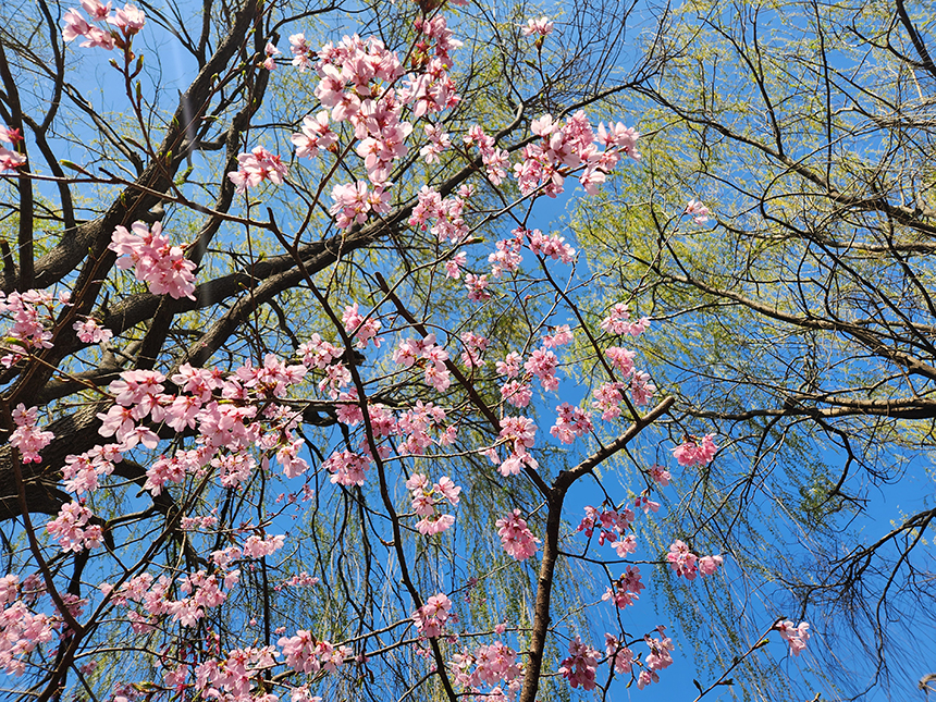 어느 벚꽃길처럼 벚꽃이나 봄꽃이 가득하길 기대한 건 아니고 수목원의 우거진 모습을 상상합니다. 하긴 아직 잎이 필 때가 아니니 우거지진 않았겠죠? 입구 앞에 키 큰 벚나무에는 벚꽃이 환하게 피어있어 고개를 들고 올려다보게 되네요.