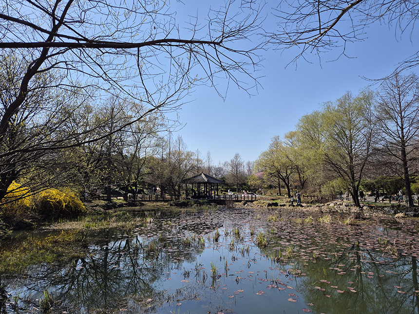 점차 연둣빛을 띠어가는 수목원의 산책을 따라 걷다 보면 아름다운 정자와 작은 연못도 만나게 됩니다. 나름 수목원의 진풍경을 모두 담고 있는 듯합니다. 초록초록한 5월이 되면 더울 예쁠 것 같아 5월에 한번 더 오기로 합니다.