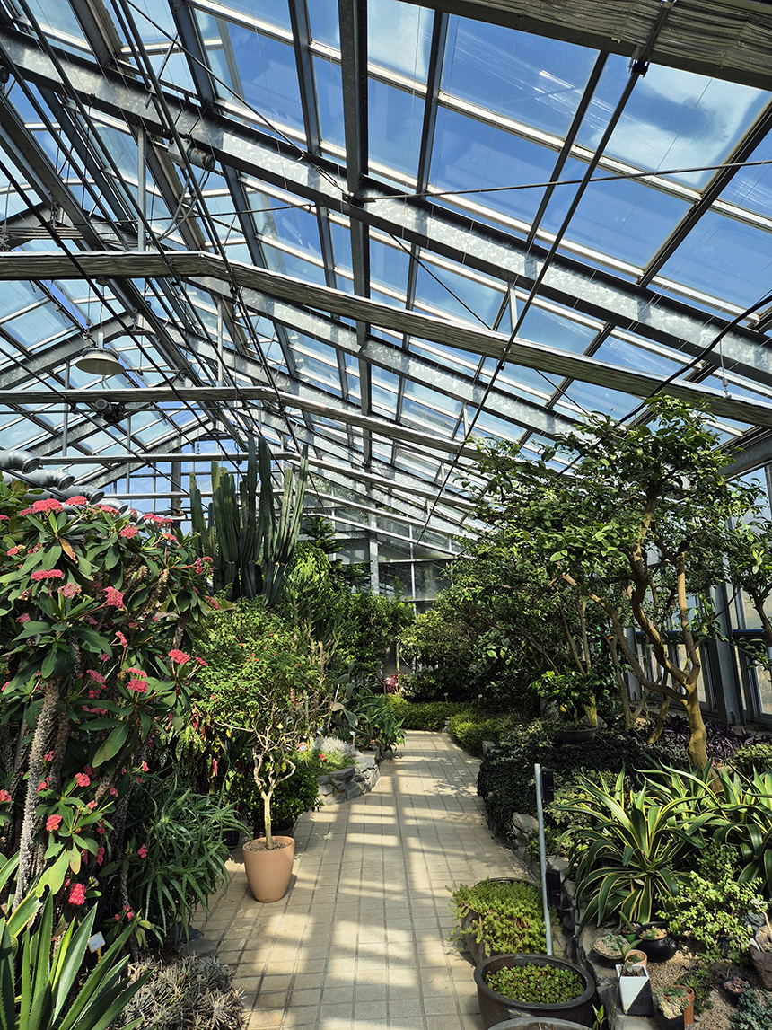 수많은 가시를 품고 있는 선인장류와 보랏빛 색을 띠는 이름 모를 꽃, 어디선가 한 번쯤은 봤을 법한 다양한 식물들이 공존하는 유리 온실입니다.