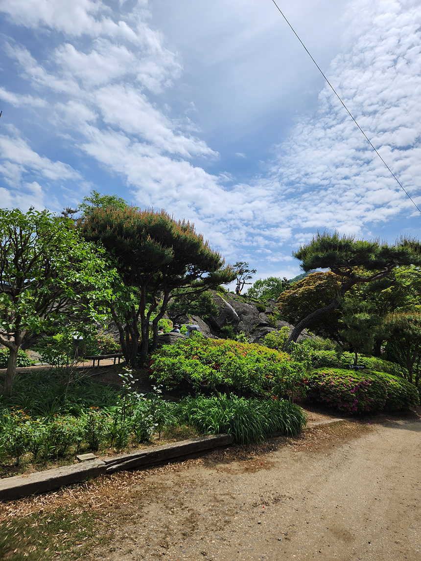 잔디광장 곳곳에 철쭉, 데이지, 이름 모를 꽃이 피어 있고 천국으로 가는 풍경처럼 살살 불어오는 바람과 햇살을 동시에 느낄 수 있는 천상의 바람길이에요.
