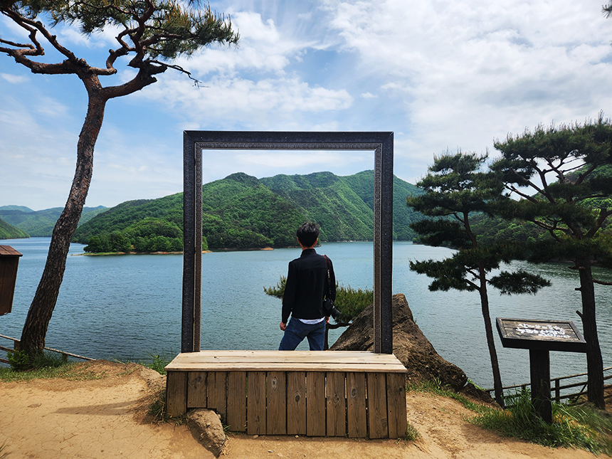 대청호를 담을 액자 포토존 앞에 서 봅니다. 왠지 부끄러워 뒷모습으로... 어린 나이도 아닌데 뭐 이리 부끄러운지 모르겠네요..