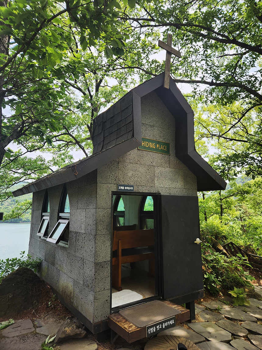 불과 5명 정도 들어갈 수 있을까? 십자가 뒤로 투명한 창 너머로 대청호를 마주한 그윽한 풍경에 매료되는 공간이네요. 신자가 아님에도 십자가 앞에 서 기도를 하고 싶은 마음이 들기도 합니다.