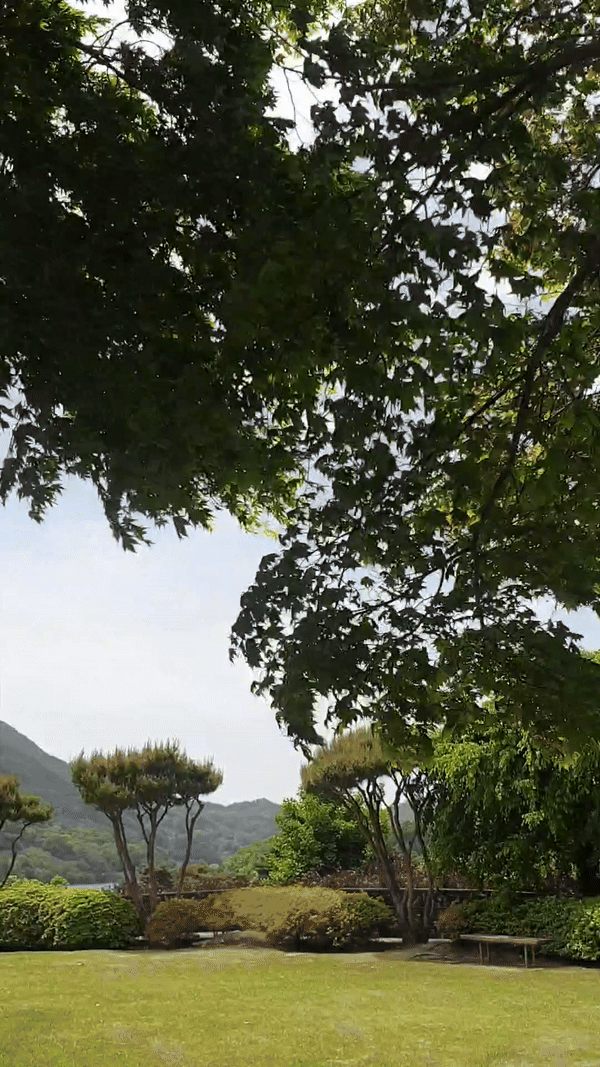 맷돌모양의 디딤돌이 한 줄로 놓인 길을 지나며 너무 예쁜 풍경이 펼쳐집니다. 마침 날씨도 좋고 하늘도 무척 맑아 연초록 잎들이 더욱 투명하게 비칩니다.